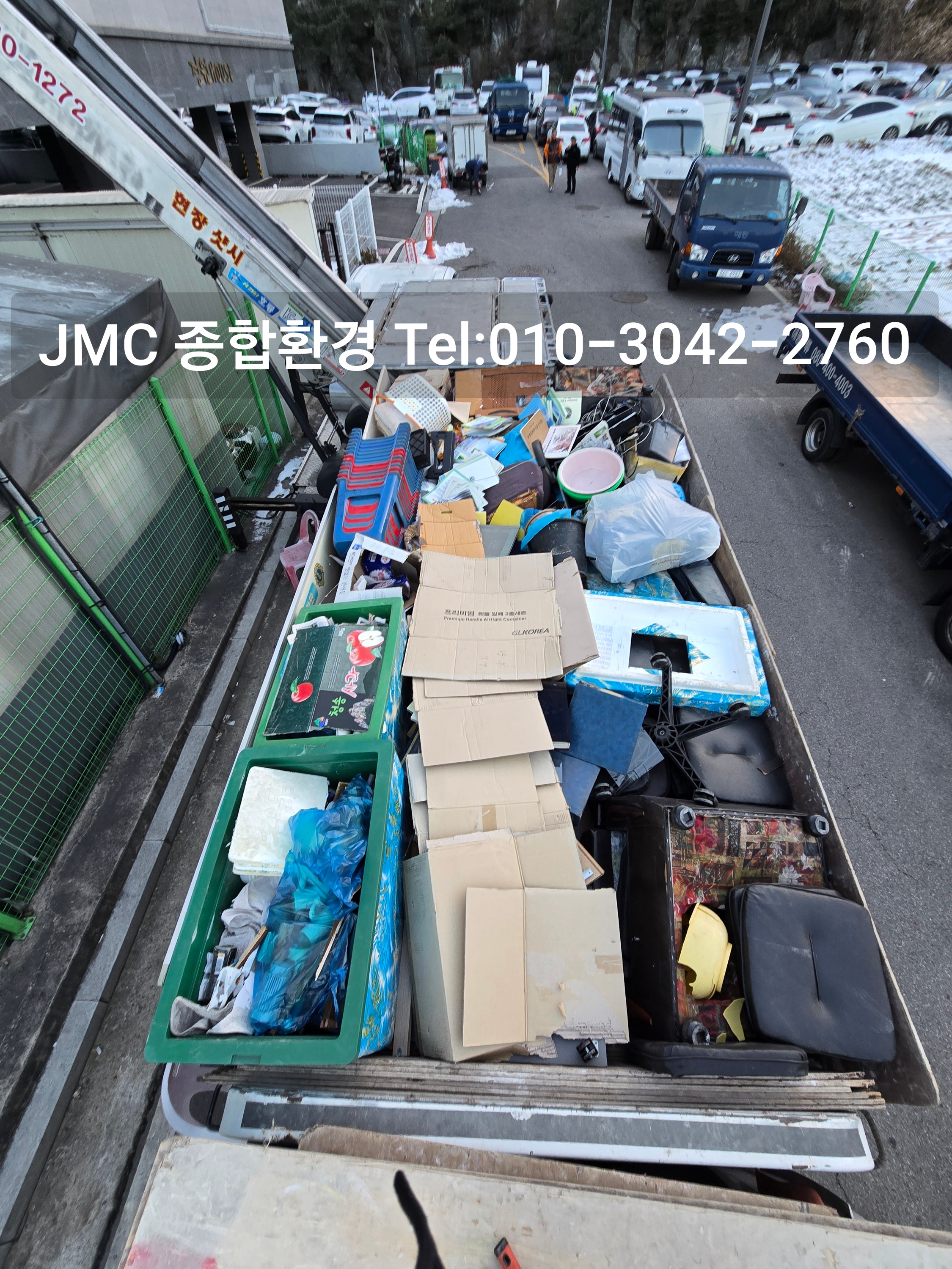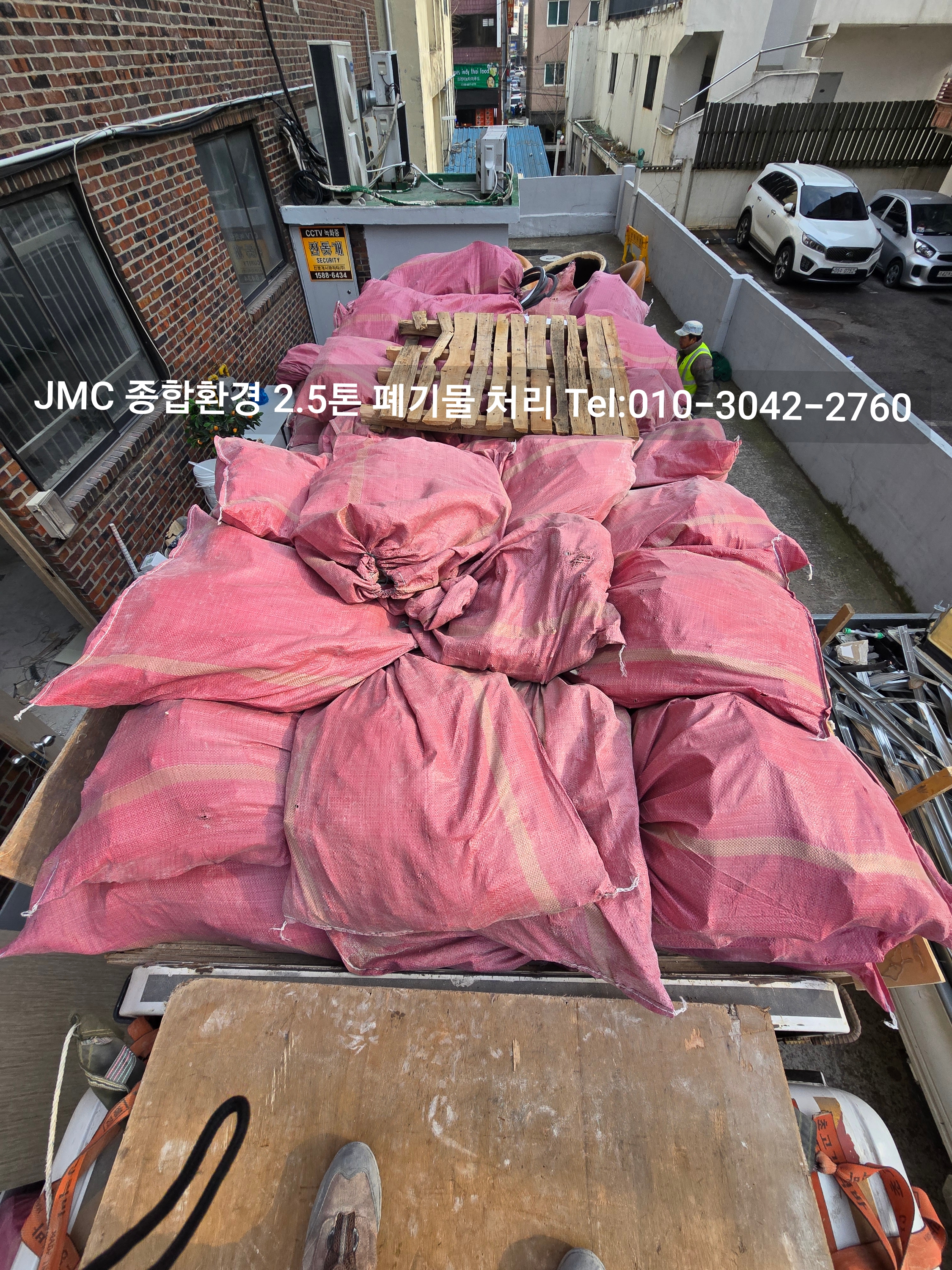 현장에 계신 작업자분이 2.5톤 폐기물 차량으로 폐기물을 올려 주시면 차곡차곡 정리를 합니다.